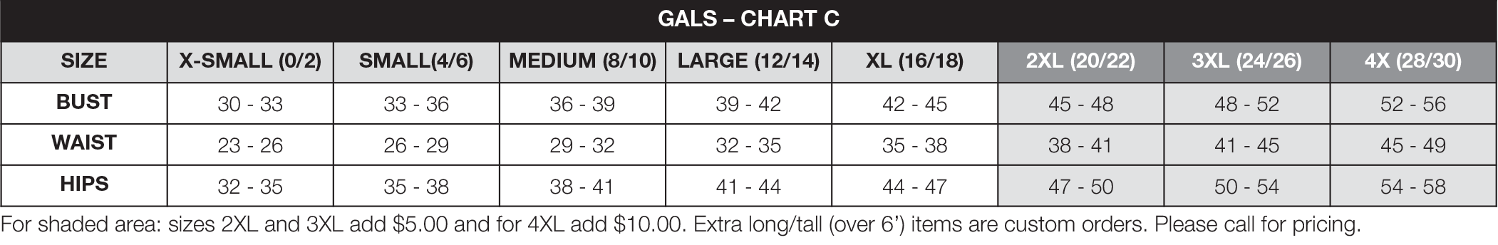 - There will be a $5 upcharge for plus sizes (size 2XL skirt and up)